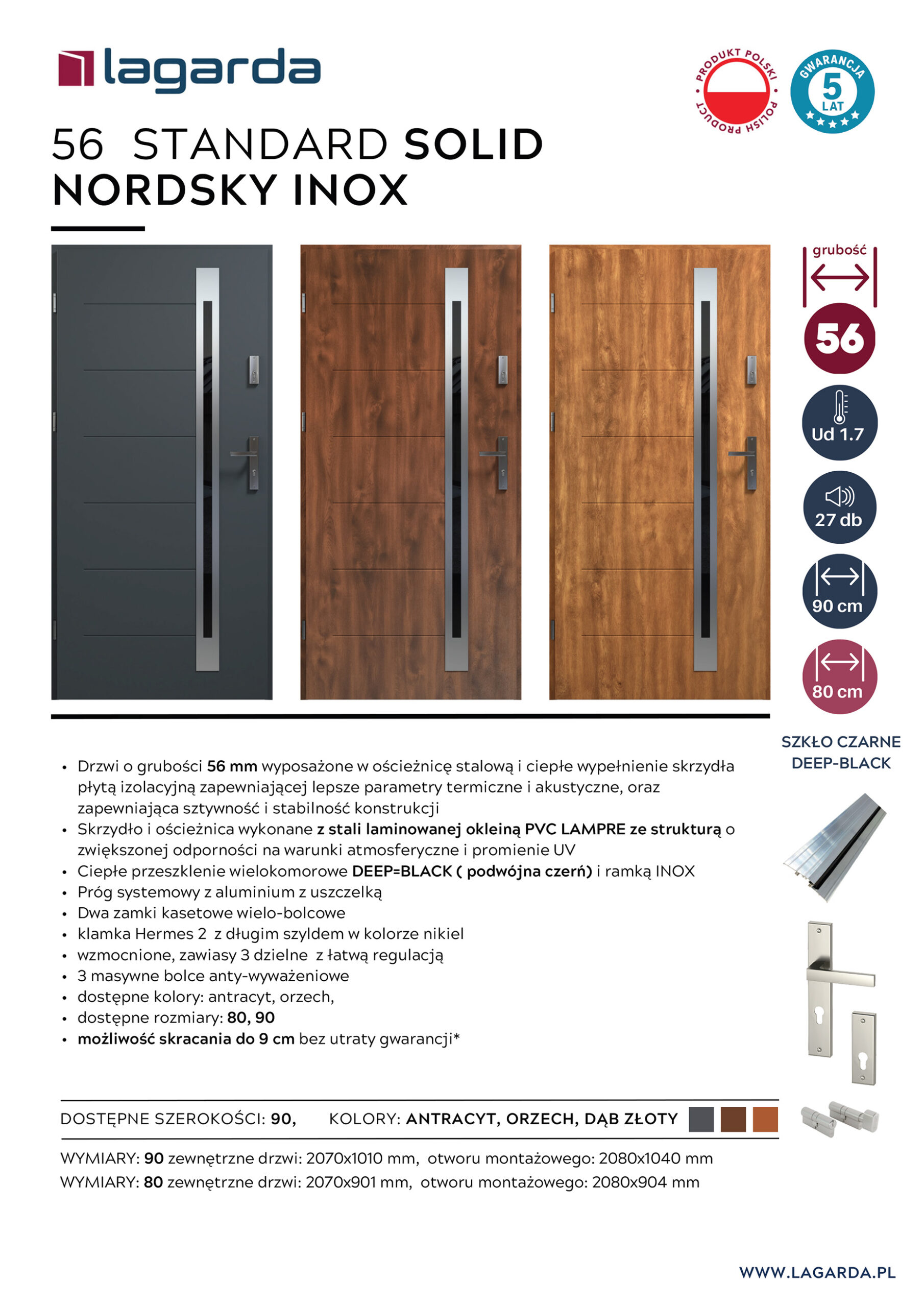 - Drzwi stalowe 56 mm wykonane ze stali laminowanej PVC LAMPRE® ze strukturą, o wysokiej odporności na czynniki atmosferyczne i promienie UV