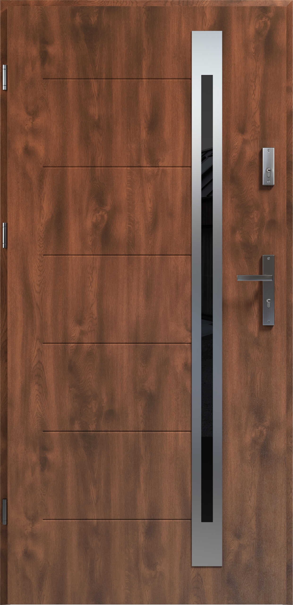 • Drzwi stalowe 56 mm wykonane ze stali laminowanej PVC LAMPRE®  ze strukturą, o wysokiej odporności na czynniki atmosferyczne i promienie UV