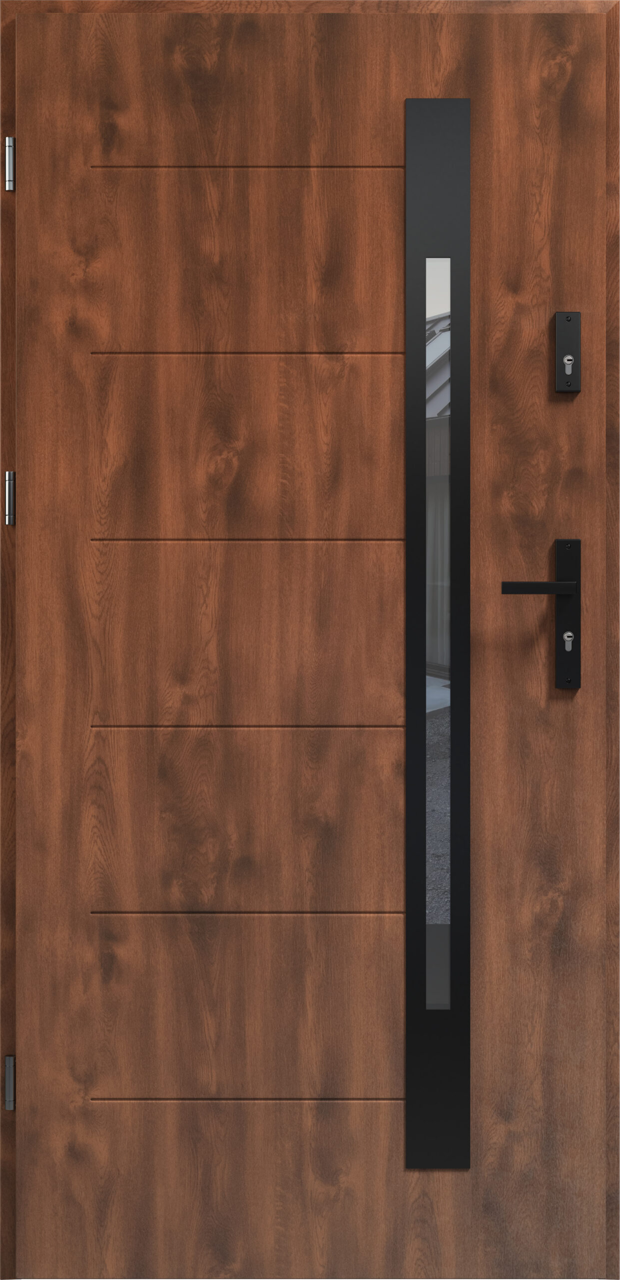 • Drzwi stalowe 56 mm wykonane ze stali laminowanej PVC LAMPRE®  ze strukturą, o wysokiej odporności na czynniki atmosferyczne i promienie UV
