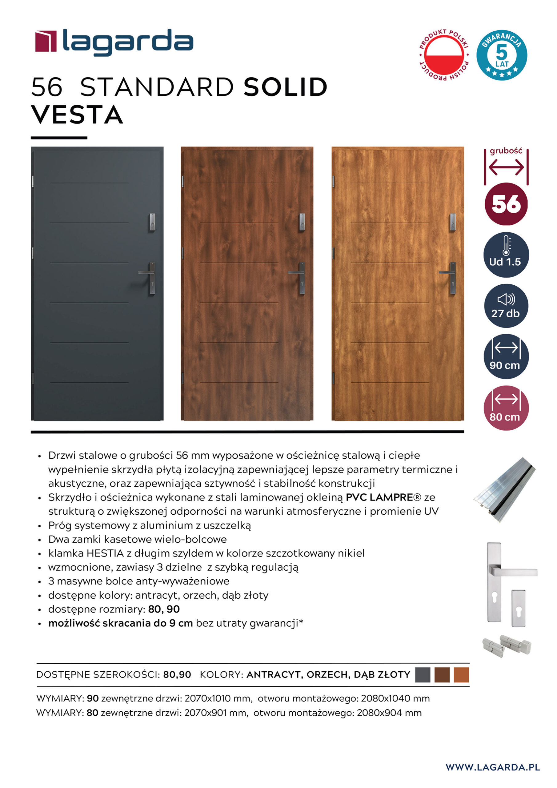 WYSOKA JAKOŚĆ – drzwi    wykonane ze stali laminowanej PVC renomowanego producenta LAMPRE® co gwarantuje najwyższą jakość: wysoka odporność na uszkodzenia, czynniki atmosferyczne i promienie UV  co przekłada się  na niezmienność powierzchni i koloru okleiny.