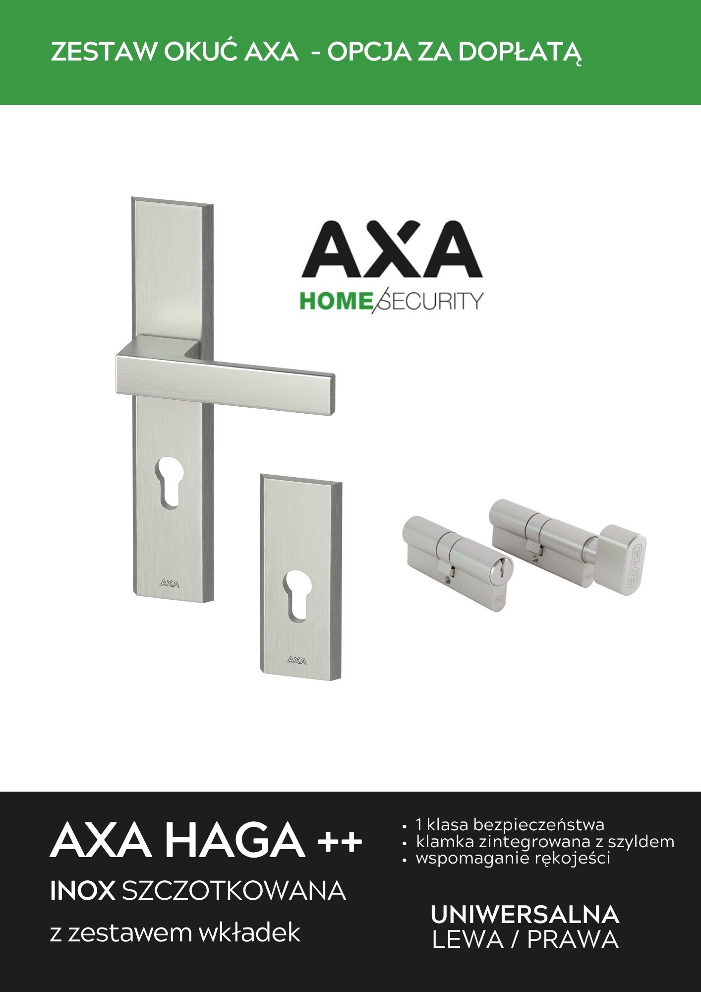 • Opcjonalnie klamka AXA HAGA ++ ze zintegrowaną rękojeścią i wspomaganiem, w wersji INOX lub czarnej (dopłata)