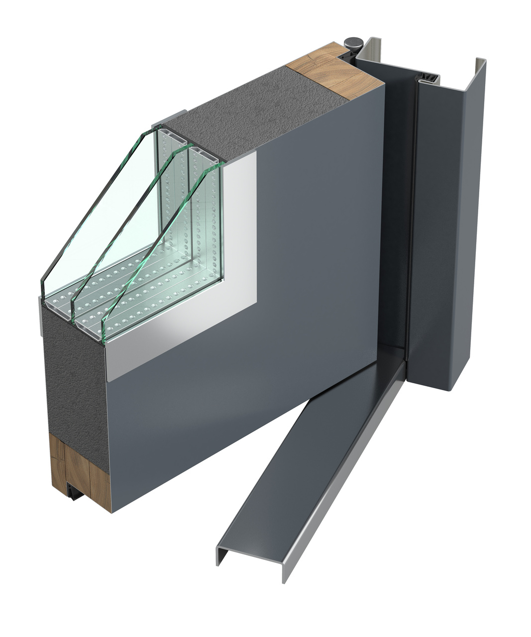 - Konstrukcja skrzydła oparta na ramie wewnętrznej z drewna klejonego, wypełnionego płytą izolacyjną EPS o podwyższonej gęstości zapewnia trwałość oraz wysokie parametry termiczne i akustyczne